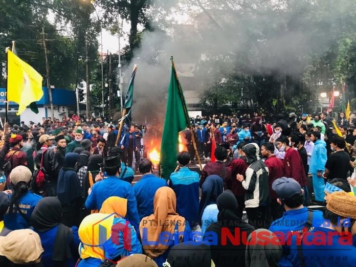 Bogor, LensaNusantara.co.id – Ratusan mahasiswa dari berbagai kampus universitas di Kota Bogor mengepung Istana Bogor, mereka berunjuk unjuk rasa menolak Undang Undang (UU) Omnibus Law Cipta, Kamis (8/10/20).