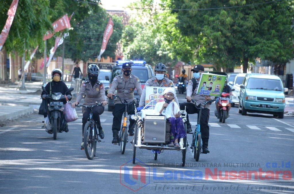 Dengan mengendarai becak dan sepeda pedal, Kasat Binmas Iptu Jembadi, SH bersama Ketua MUI Situbondo KH. Syaiful Muhyi dan Bhabinkamtibmas berkelilig kota Situbondo menyampaikan imbauan protokol kesehatan sesuai Inpres No 06 tahun 2020 dan Perbup Situbondo No 45 tahun 2020 yaitu dengan memakai masker ketika keluar rumah, menjaga jarak ketika berkomunikasi dengan orang lain dan sering cuci tangan dengan air yang mengalir setelah melakukan aktivitas.