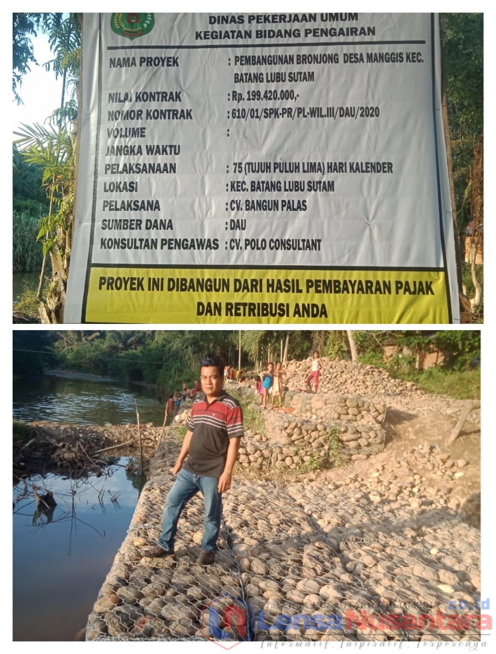 Pemerintah Kabupaten Padang Lawas melalui dinas pekerjaan umum kegiatan bidang pengairan membangun bronjong di Desa Manggis Kecamatan Batang Lubu Sutam Kabupaten Padang Lawas (palas) dengan nilai kontrak Rp. 199.420.000,dengan nomor kotrak :610/01/SPH-PR/PL-WILII/ DAU/2020