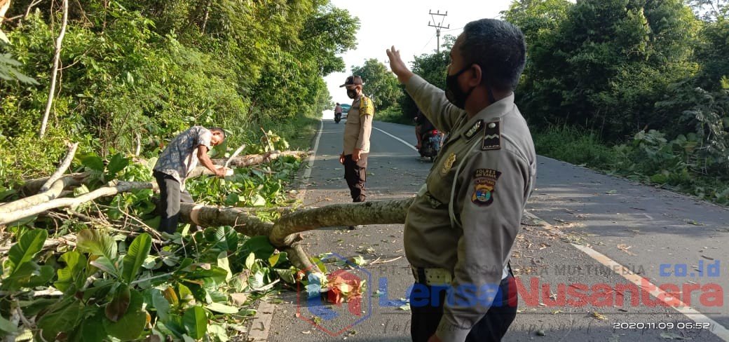 jajaran Polsek Baradatu mengevaluasi batang pohon tumbang yang sempat sedikit menganggu penguna jalan yang melintasi jalan tersebut.
