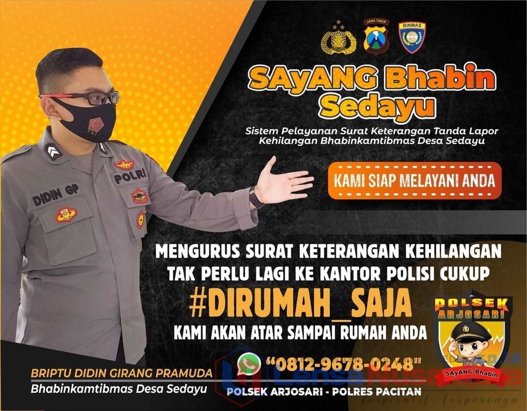 Pacitan, LENSANUSANTARA.CO.ID – Untuk memberikan pelayanan terbaik yang optimal dimasa pandemi covid 19 kepada masyarakat, terobosan dan inovasi yang dilakukan Briptu Didin GP, anggota Bhabinkamtibmas Desa Sedayu Polres Pacitan Polda Jatim patut diacungi jempol.