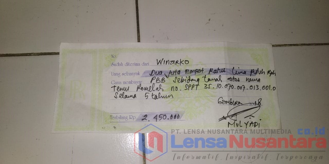 Hal tersebut dikatakannya oleh Rofiq warga Dusun Lidah, “Seperti yang tertulis di kwitansi ini. Nilai yang terbayarkan Rp. 2.450.00 kepada Kadus Mulyadi selama 5 tahun kedepan, dari 2018 hingga 2023.” kata Rofiq.