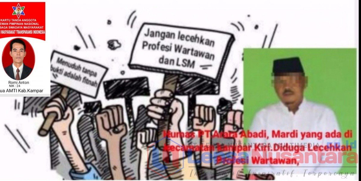 LSM AMTI DPD Kabupaten Kampar  (Aliansi Masyarakat Transparansi Indonesia) meminta aparat kepolisian menindaklanjuti pasal penghinaan yang dilakukan Humas PT.Arara Abadi mardi terhadap insan pers.”pungkasnya.(dsl)