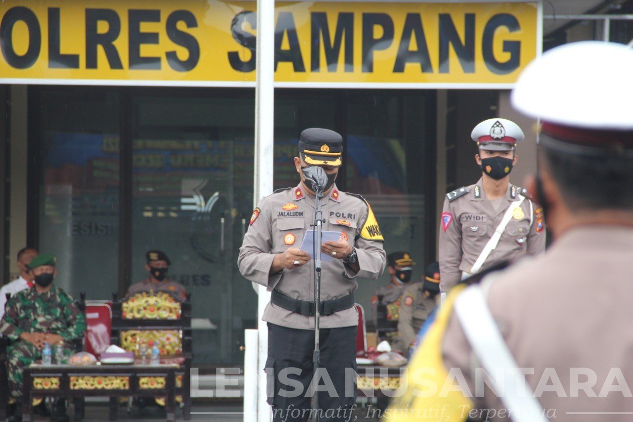 Kompol Jamaludin SH. Selaku Waka Polres Sampang. Pimpin apel gelar pasukan dilaksanakan saat hujan gerimis Turut hadir Kasdim 0828 Sampang, Kasat Pol PP dan perwakilan Kadishub Sampang.