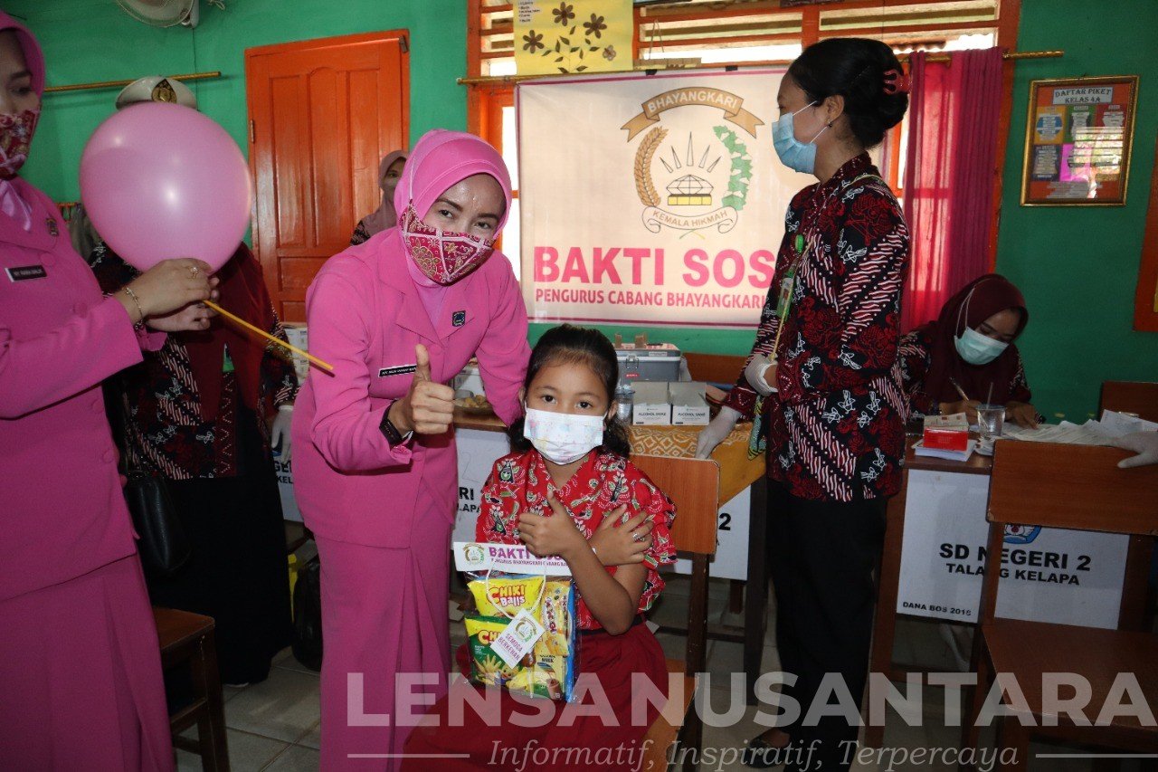 Dalam pelaksanaan vaksinasi tersebut Kapolres Banyuasin dan Ketua Bhayangkari Cabang Banyuasin menyapa anak-anak yang akan divaksin dengan memberikan semangat dan Bakti Sosial Berupa Makanan ringan kepada Siswa/siswi SDN 2 Talang Kelapa agar anak-anak tidak takut untuk divaksin.