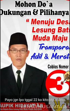 Muratara, LENSANUSANTARA.CO.ID – Salah satu calon kepala desa Lesung batu Muda Kecamatan Rawas Ulu Kabupaten Musi Rawas Utara(Muratara)Provinsi-Sumatera Selatan maju mencalonkan diri dengan nomor urut 3.