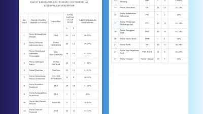 “Sebanyak 24 partai yang menjadi peserta pemilu, setidaknya ada 5 partai yang tersisihkan disebabkan karena tidak mendaftarkan nama Bacalegnya, sehingga sesuai rapat pleno kemarin KIP Aceh memutuskan ada 19 Partai yang lolos di Pileg 2024 mendatang”, Terang Yuardha.