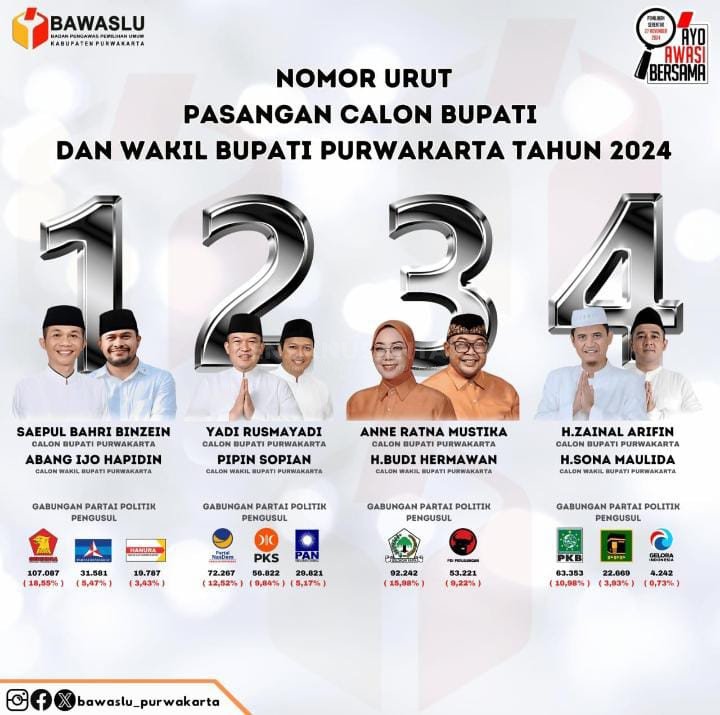 Purwakarta, LENSANUSANTARA.CO.ID – Komisi Pemilihan Umum (KPU) Purwakarta, Provinsi Jawa Barat, menggelar rapat pleno terbuka pengundian dan penetapan nomor urut pasangan calon Bupati dan Wakil Bupati, Senin (23/9/2024).