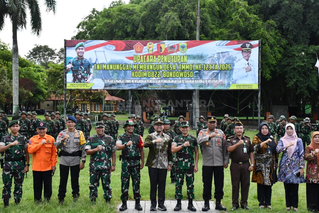 Bondowoso, LENSANUSANTARA.CO.ID – Setelah 30 hari penuh kerja keras, Program TNI Manunggal Membangun Desa (TMMD) ke-123 resmi ditutup dengan upacara di Alun-Alun RBA Bondowoso. Acara ini dipimpin oleh Kolonel Tek Arie Santoso, Perwira Liaison Officer (Pa LO) TNI AU Kodam V/Brawijaya, yang bertindak sebagai Inspektur Upacara. Kamis (20/3/2025).