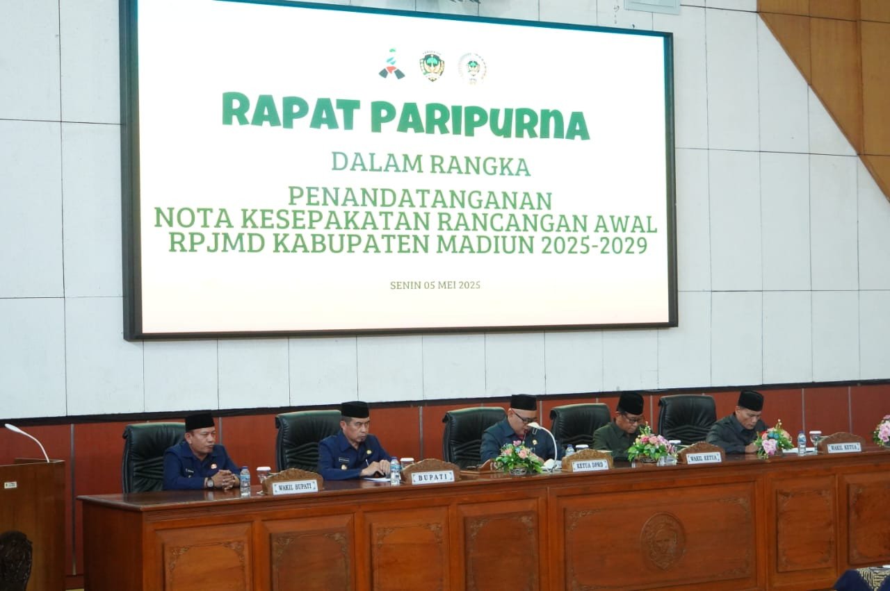 Madiun, LENSANUSANTARA.CO.ID – DPRD Kabupaten Madiun menggelar rapat paripurna untuk menandatangani nota kesepakatan rancangan awal Rencana Pembangunan Jangka Menengah Daerah (RPJMD) tahun 2025–2030, pada Senin (5/5). Rapat ini dipimpin langsung oleh Ketua DPRD, Fery Sudarsono.