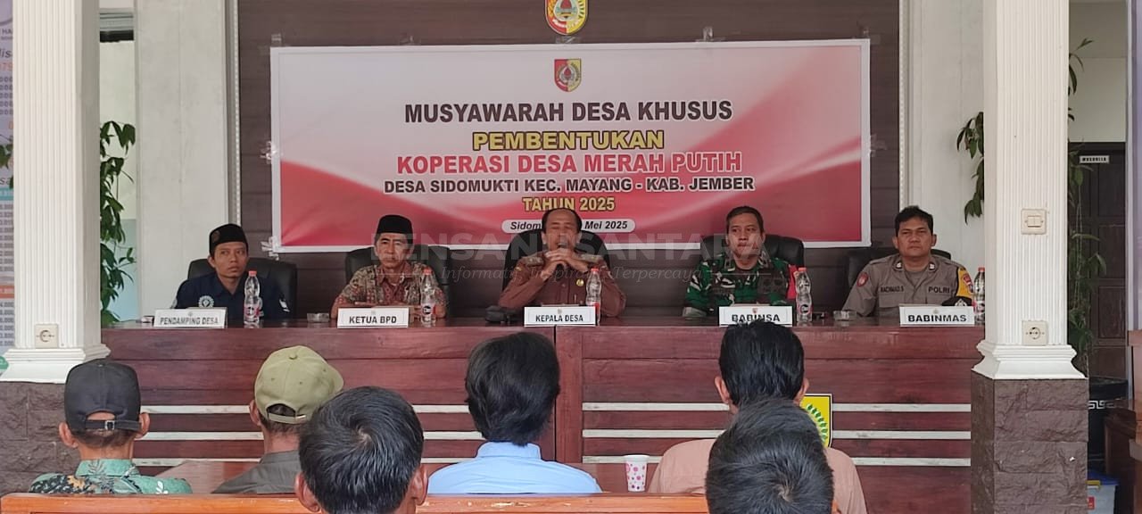 Jember, LENSANUSANTARA.CO.ID – Satu satunya pemerintah desa Sidomukti kecamatan mayang menggelar musyawarah desa khusus pembentukan koperasi desa merah putih melibatkan masyarakat, Selasa (6/5/2025).