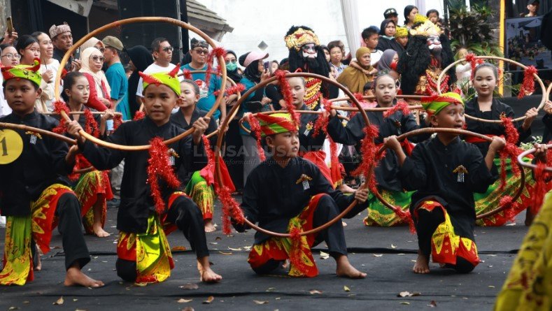 Suasana makin meriah saat kelompok-kelompok peserta menampilkan atraksi budaya dalam sebuah defile. Masing-masing mengusung tema permainan khas anak tempo dulu.