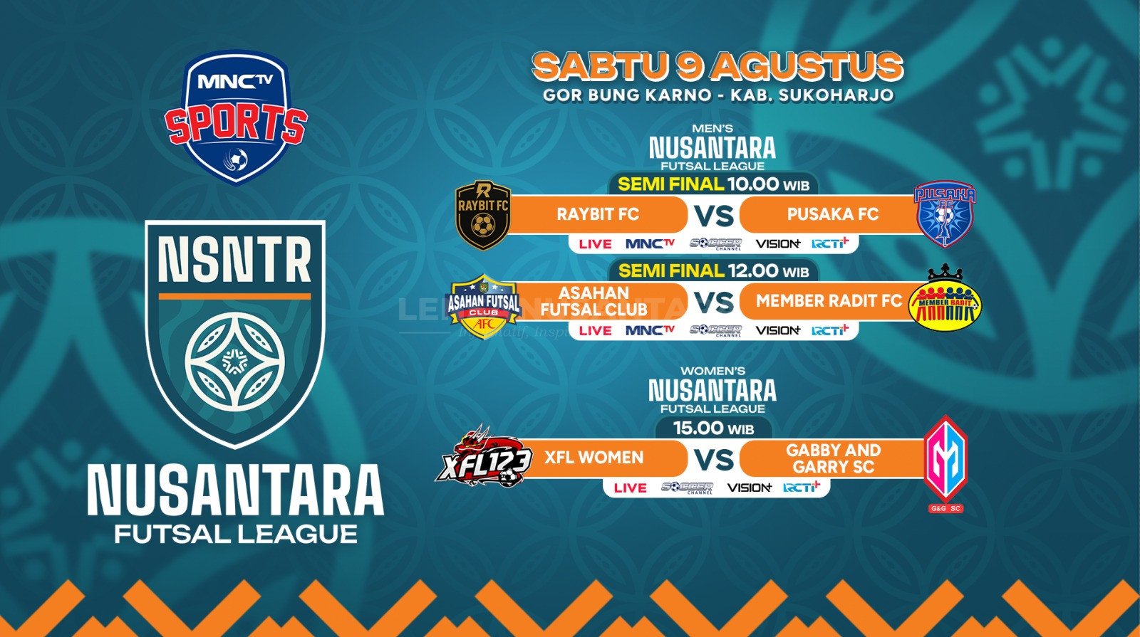 MNCTV menayangkan dua laga semifinal pada Nusantara Futsal League 2025 Sabtu, 9 Agustus 2025 antara Raybit FC vs Pusaka FC pada pukul 10.00 WIB dan Asahan Futsal Club vs Member Radit FC pada pukul 12.00 WIB.