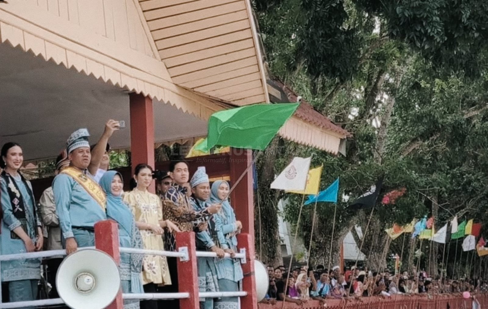 Di genggaman Wapres Gibran didampingi istri Selvi, bendera Hijau berkibar saat melepas jalur pada hari pertama. Turut mendampingi Menteri Pariwisata RI, Menteri Kebudayaan RI dan Menteri Pemuda dan Olahraga RI Dito Ariotedjo, Gubernur Riau dan Forkompimda Riau serta Bupati Kuansing Suhardiman Amby. (Suhendi)