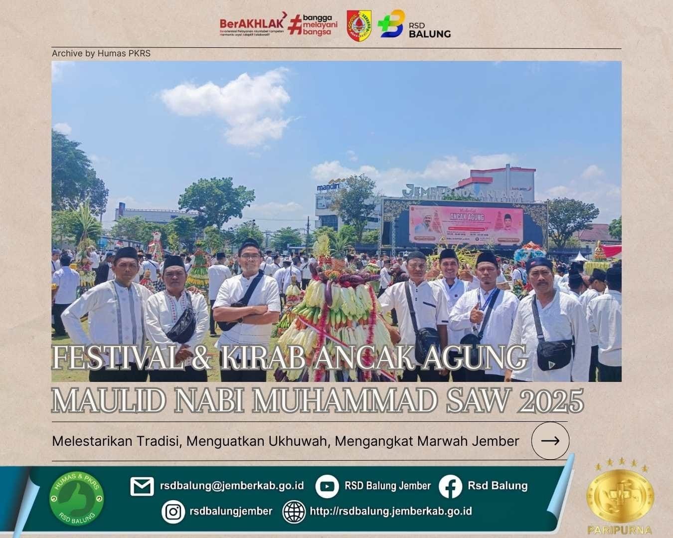 “Dengan partisipasi dalam Festival Budaya Religi dan Kirab Ancak Agung 2025, RSD Balung menegaskan perannya bukan hanya sebagai penyedia layanan kesehatan, tetapi juga mitra masyarakat dalam melestarikan tradisi, memperkuat nilai spiritual, dan menumbuhkan semangat kebersamaan,” tutup Rangga.