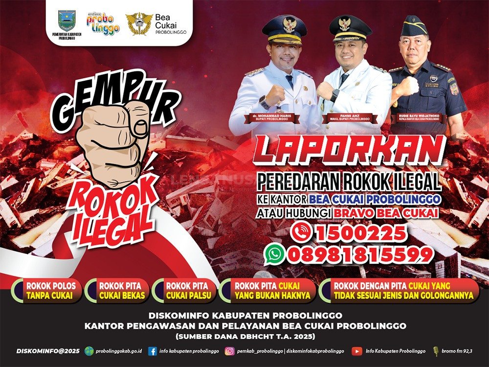 Probolinggo, LENSANUSANTARA.CO.ID – Pemerintah Kabupaten Probolinggo bersama Bea Cukai Probolinggo terus menggencarkan sosialisasi pemberantasan rokok ilegal. Melalui kampanye bertajuk “Gempur Rokok Ilegal”, masyarakat diajak untuk berperan aktif melaporkan setiap bentuk peredaran rokok ilegal di wilayah Kabupaten Probolinggo.
