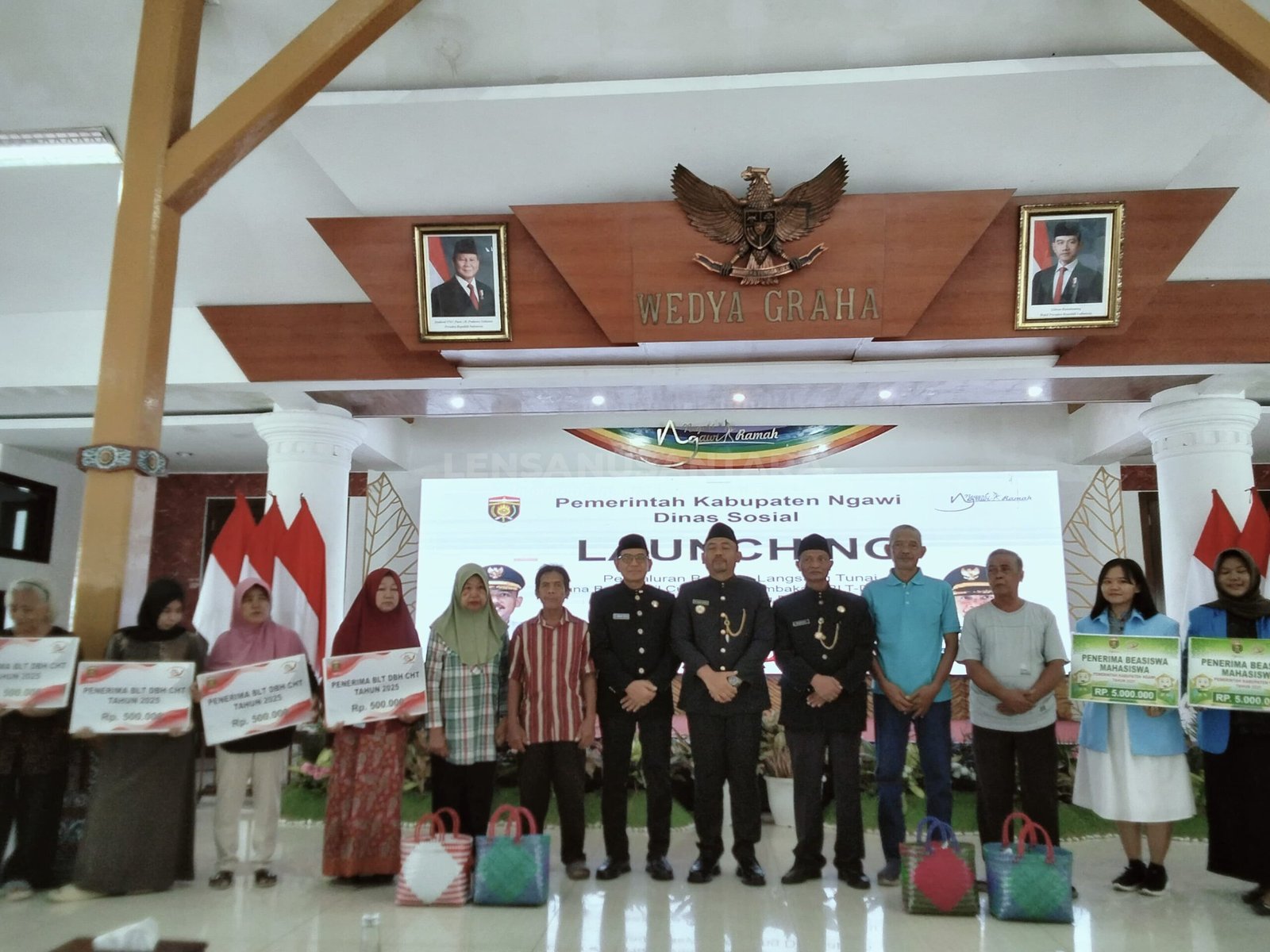 Kepala Dinas Sosial Kabupaten Ngawi, Bonadi, menyampaikan dalam sambutannya “BLT-DBHCHT tahun 2025 disalurkan kepada 7.397 penerima, terdiri dari masyarakat berpenghasilan rendah serta keluarga dalam lokus stunting dan tuberkulosis, masing-masing menerima Rp500.000”.
