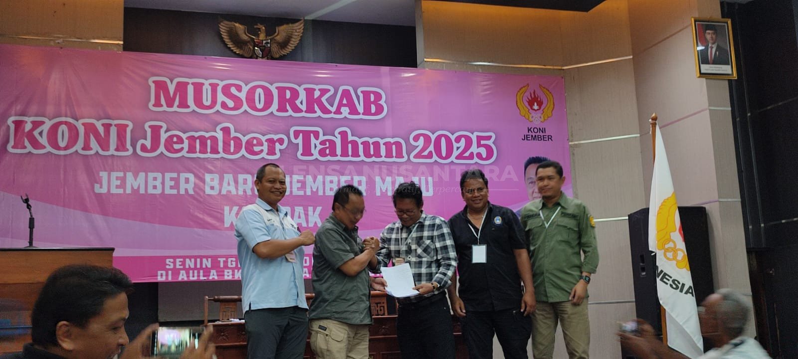 Jember, LENSANUSANTARA.CO.ID – Ervan Priambodo secara aklamasi terpilih sebagai Ketua Komite Olahraga Nasional Indonesia (KONI) Kabupaten Jember periode 2025–2029 dalam Musyawarah Olahraga Kabupaten (Musorkab). Sebanyak 46 cabang olahraga (cabor) yang memiliki hak suara hadir dalam forum Musorkab dan sepakat mendukung penuh Ervan Priambodo.