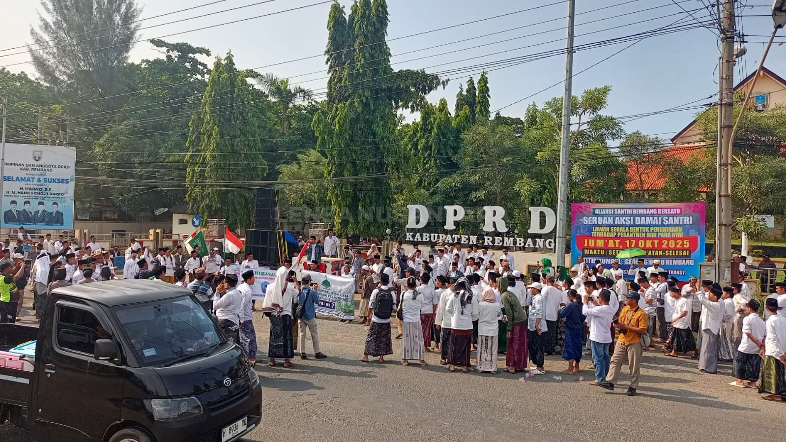 Rembang, LENSANUSANTARA.CO.ID – Ratusan Kiai dan Santri yang tergabung dalam gerakan Santri Rembang Bersatu menggelar aksi damai di depan Gedung DPRD Kabupaten Rembang, Jumat siang (17/10/2025). Mereka datang sekitar pukul 14.00WIB