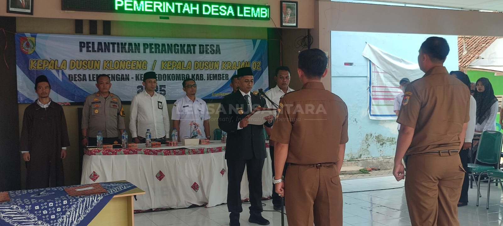 Jember, LENSANUSANTARA.CO.ID — Pemerintah Desa Lembengan, Kecamatan Ledokombo, Kabupaten Jember, melaksanakan pelantikan dan pengambilan sumpah jabatan dua perangkat desa baru, yakni Kepala Dusun Klonceng dan Kepala Dusun Krajan II, pada Rabu (22/10/2025).
