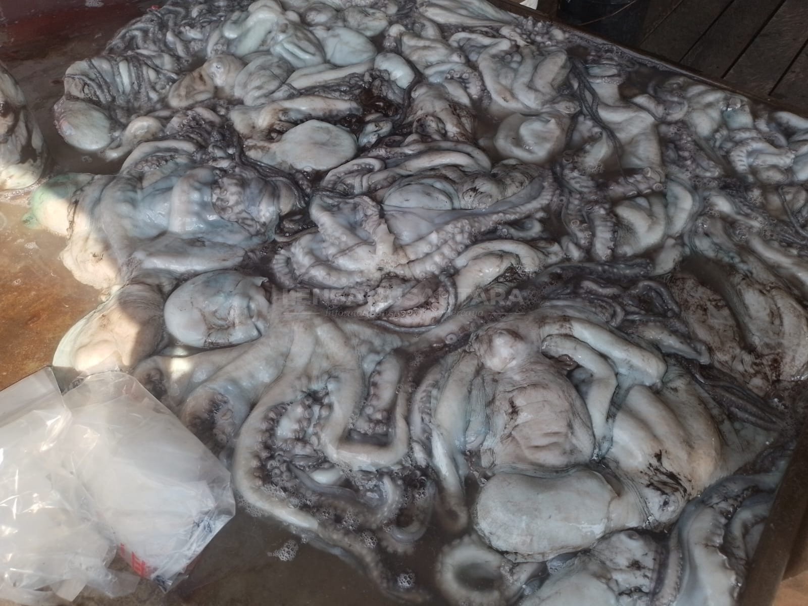 Di bawah terik matahari, aktivitas para nelayan tampak tak surut. Mereka membersihkan hasil tangkapan di tepi perahu, sementara aroma asin laut berpadu dengan bau segar gurita yang baru diangkat dari dasar laut.
