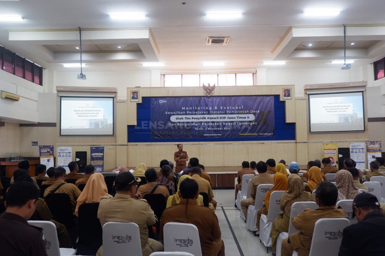 Lamongan, LENSANUSANTARA.CO.ID – Dalam upaya memperkuat tata kelola keuangan desa yang transparan dan akuntabel, Kantor Wilayah Direktorat Jenderal Pajak (Kanwil DJP) Jawa Timur II bekerja sama dengan Dinas Pemberdayaan Masyarakat dan Desa (DPMD) Kabupaten Lamongan serta Kejaksaan Negeri Lamongan menggelar kegiatan Monitoring dan Evaluasi (Monev) Kewajiban Perpajakan Instansi Pemerintah Desa (IPDes) se-Kabupaten Lamongan, Senin (3/11).