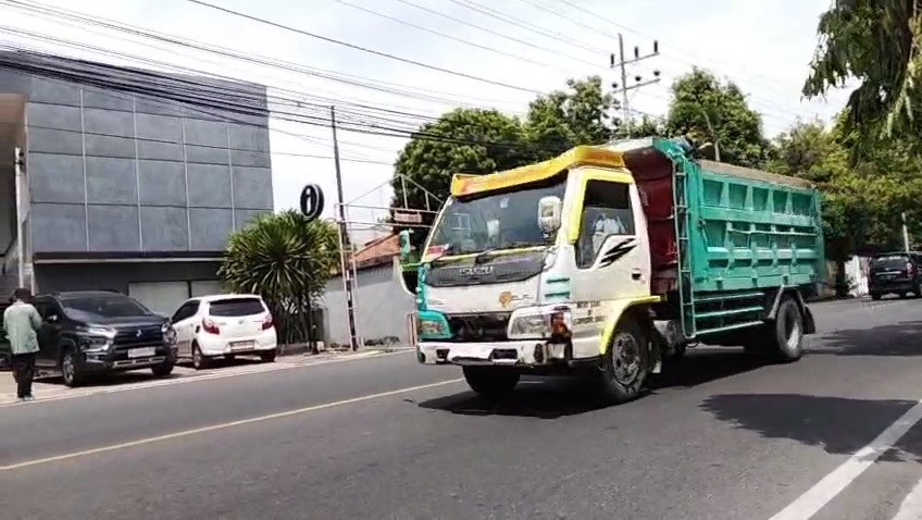 Ket : truk pengangkut pasir melaju tanpa tutup terpal di wilayah kota madiun membahayakan pengendara lain.