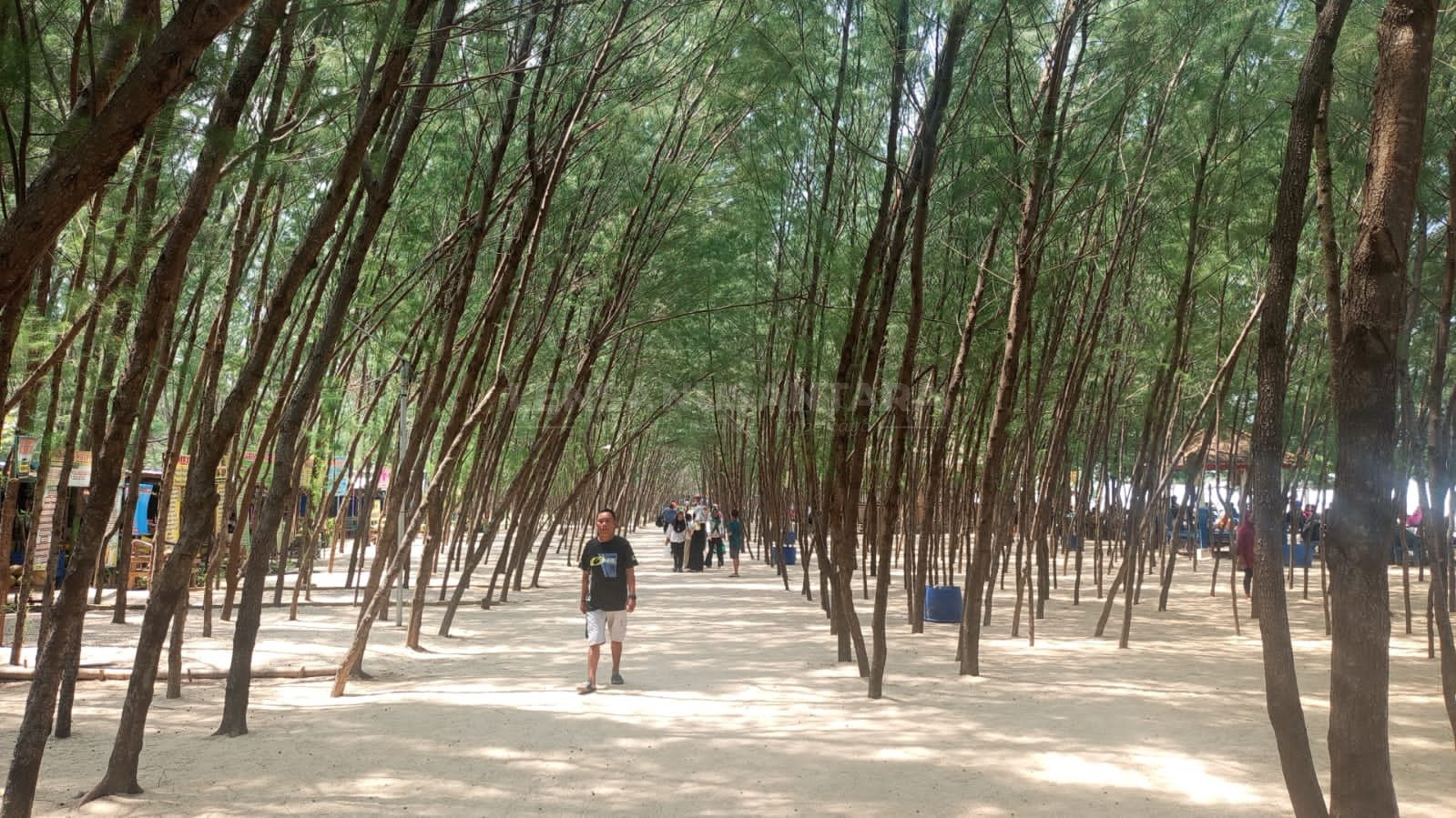 Salah satu keunikan pantai Wates yang membuat wisatawan betah untuk beristirahat melepas penat di hutan cemara. Minggu (30/11/2025) Foto : putra