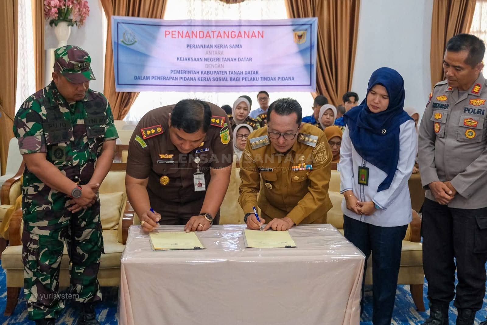 Penandatanganan dilakukan oleh Kepala Kejaksaan Negeri Batusangkar, Anggiat A.P Pardede, bersama Bupati Tanah Datar, Eka Putra. Kegiatan tersebut turut disaksikan oleh Dandim 0307 Tanah Datar, Kepala Pengadilan Negeri Batusangkar, Sekda Tanah Datar, Asisten Administrasi Umum, serta sejumlah undangan lainnya.