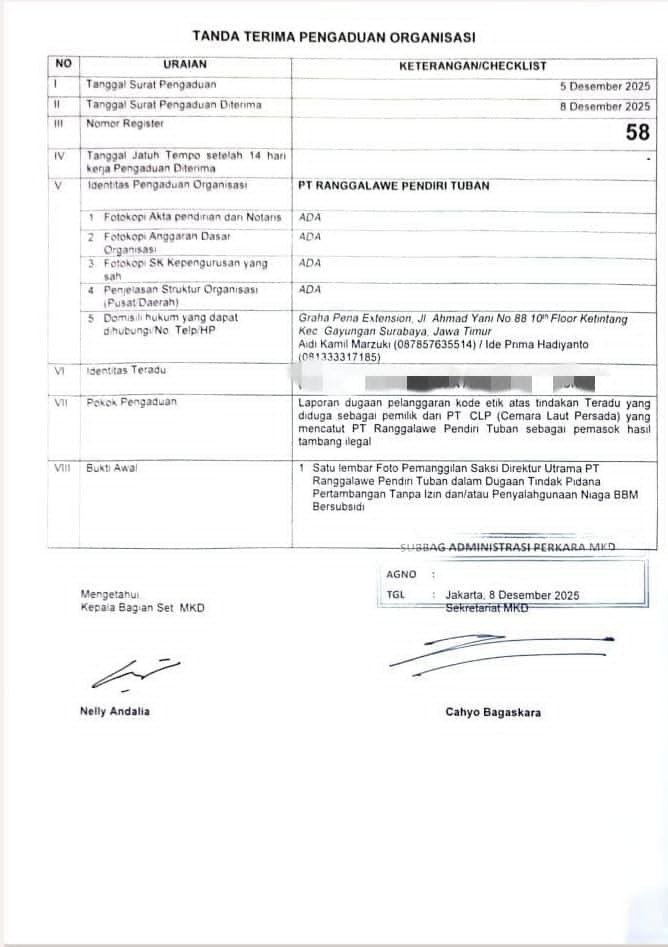 “Laporan MKD DPR-RI Nomor 58, tertanggal 8 Desember 2025 diterima langsung oleh Subbag Administrasi Perkara MKD DPR RI atas nama Cahyo Bagaskara dan ditandatangani Kabag Sekretariat MKD, Nelly Andalia,” kata Ide Prima Hadiyanto, dalam keterangannya, Selasa, 09 Desember 2025.