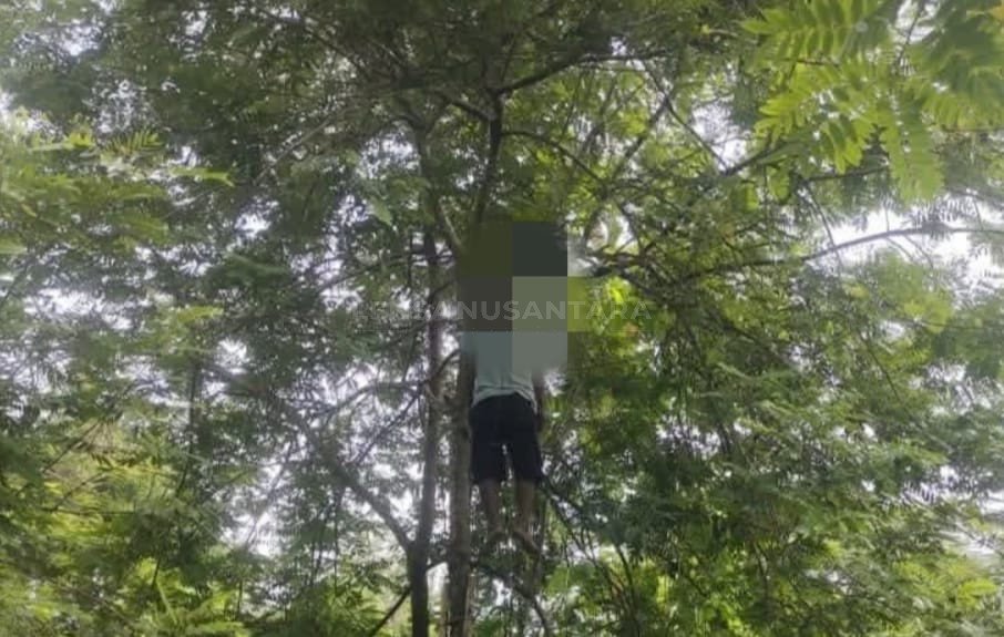 Korban ditemukan dalam posisi tergantung di atas pohon dengan ketinggian sekitar 4 meter. Pada leher korban terdapat bekas jeratan.