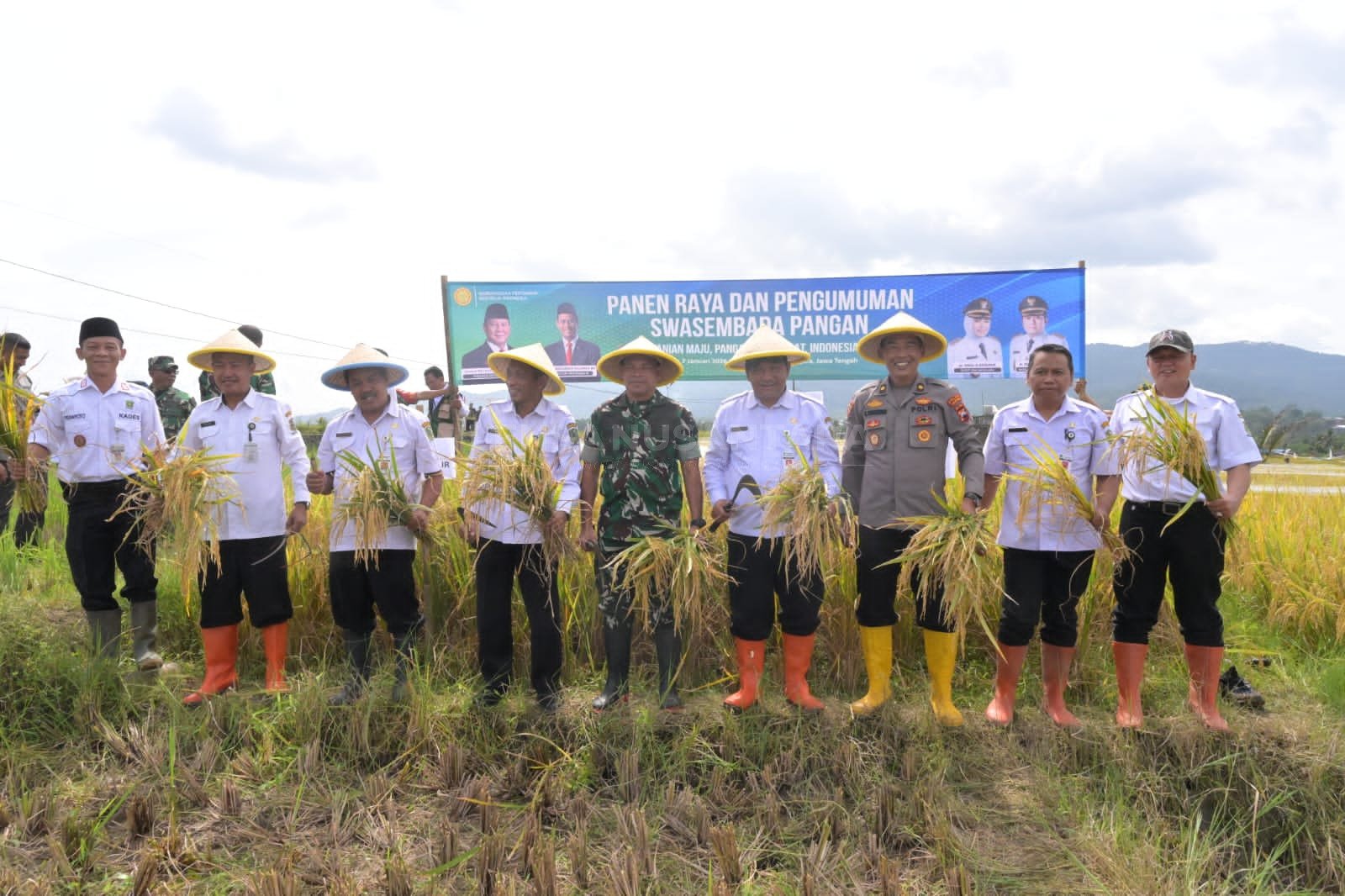 PJ Sekda Banjarnegara Tursiman foto bersama jajaran Forkopimda di acara panen raya di Jenggawur, Rabu, 7/1/2025.