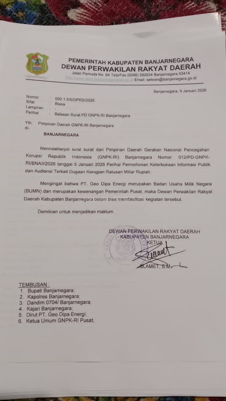 Penolakan tersebut dituangkan dalam surat balasan dari DPRD Banjarnegara Slamet kepada PD GNPK-RI dengan nomor 000.1.5/5/DPRD/2026.