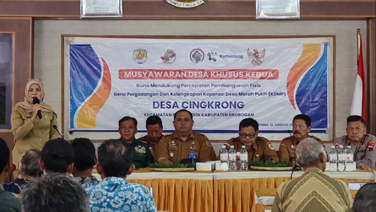 Grobogan, LENSANUSANTARA.CO.ID – Pemerintah Desa Cingkrong Kecamatan Purwodadi menggelar Musyawarah Desa Khusus Kedua pada Senin (12/01/26) sore.Hasil musyawarah dengan sejumlah perwakilan warga, tokoh masyarakat, dan tokoh agama tersebut berjalan alot. Rapat yang dihadiri oleh Kepala Dinas Koperasi dan UKM Grobogan Kasan Anwar, Perwakilan Dispermasdes, Camat Purwodadi Tondi Sumarjaka, Kapolsek Purwodadi AKP Siswanto serta Danramil Purwodadi Kapten Inf Miftahul Huda dimulai dengan pemaparan dari Kades Cingkrong Jasmi kepada warga masyarakat yang kemudian dilanjutkan sambutan dari Forkompimcam Purwodadi.
