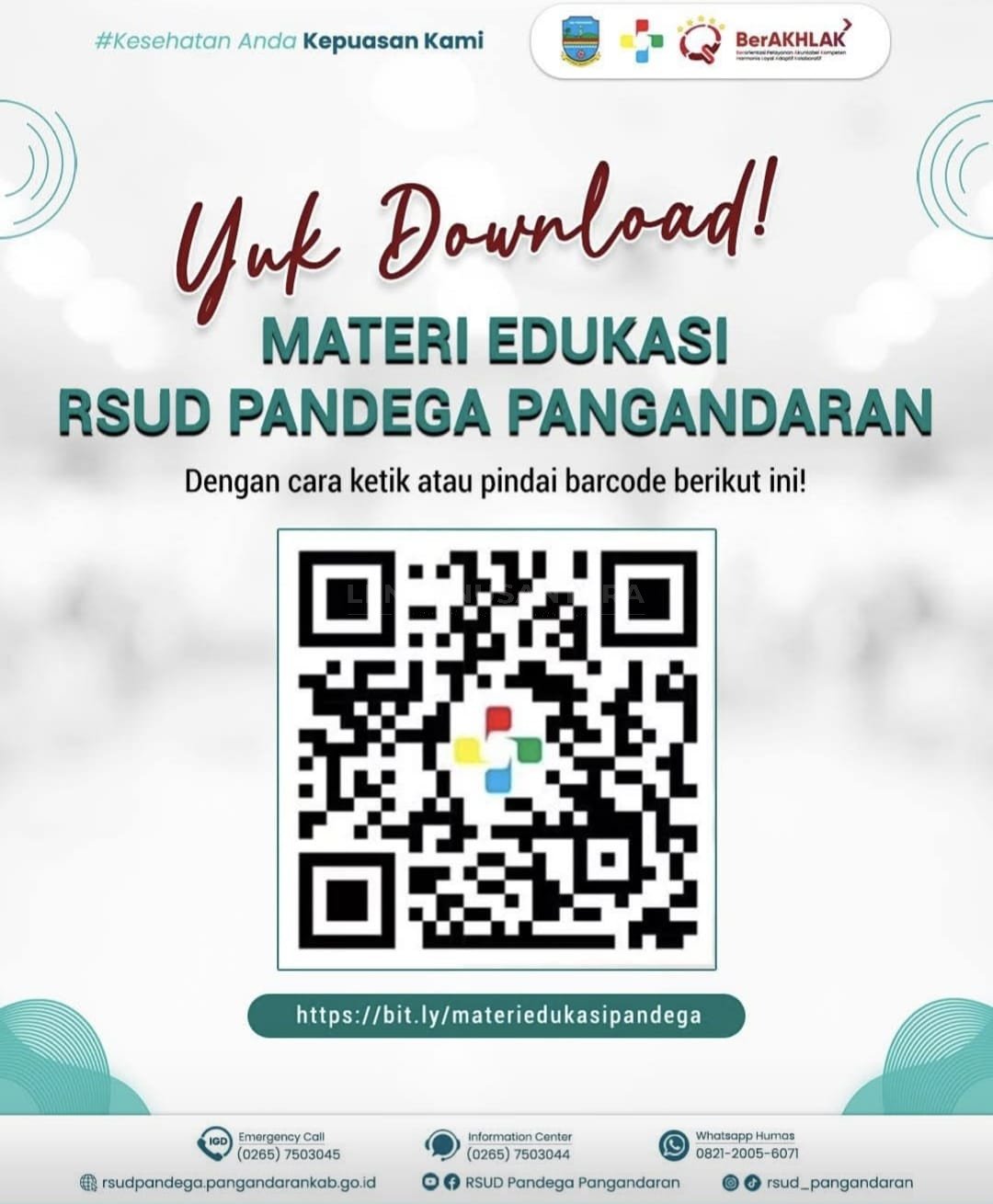 RSUD Pandega menyediakan untuk semua lapisan masyarakat untuk mempermudah melihat materi edukasi yang bisa diunduh materi edukasi tersebut melalui tautan https://bit.ly/materiedukasipandega. ( N