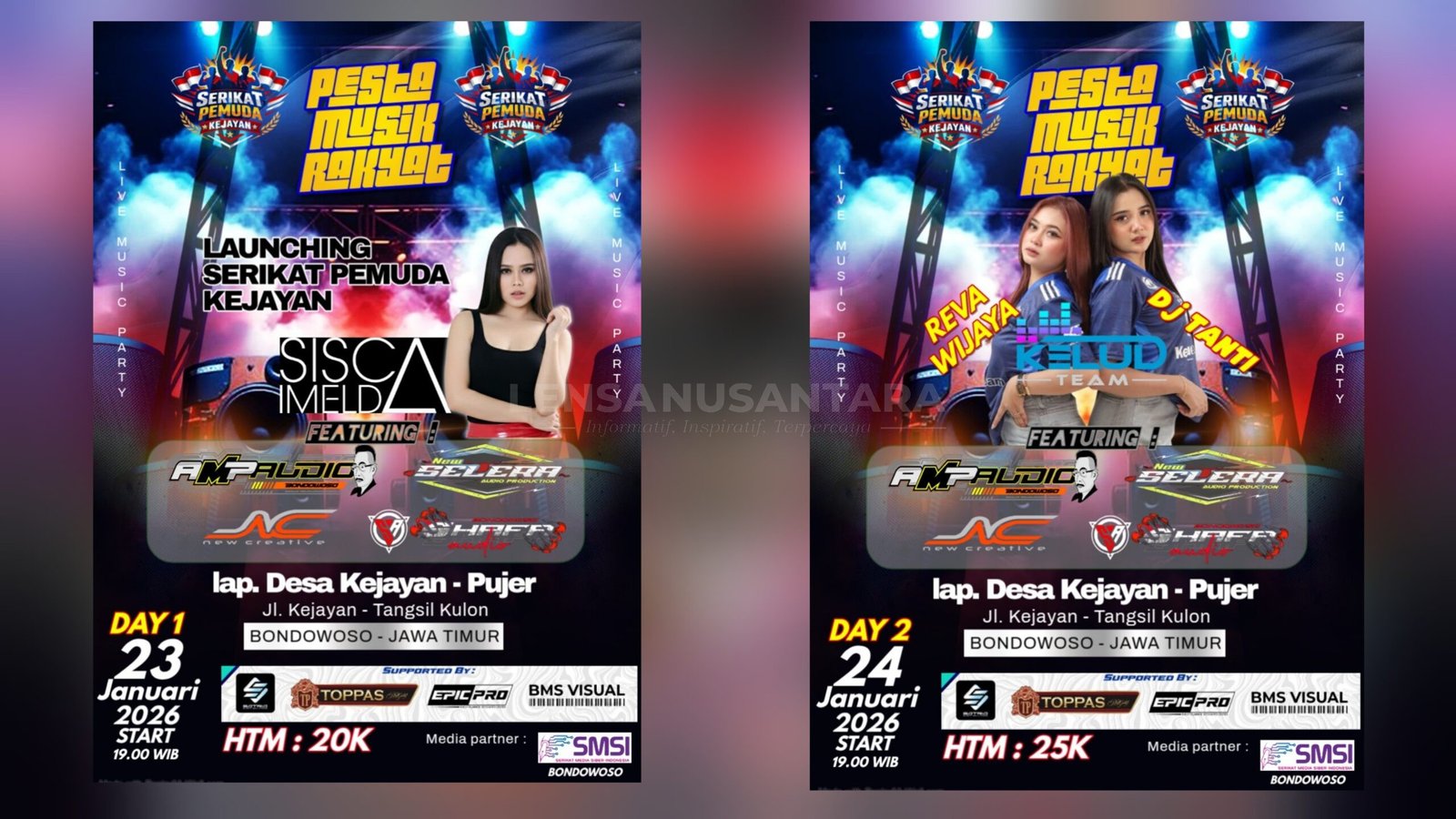 Bondowoso, LENSANUSANTARA.CO.ID – Hadiri dan Saksiskan Pesta Musik Rakyat pada 23–24 Januari 2026 yang akan digelar oleh Serikat Pemuda Kejayan, bertempat di Lapangan Desa Kejayan, Kecamatan Pujer, Kabupaten Bondowoso. Acara ini menjadi hiburan rakyat yang disambut antusias oleh masyarakat setempat maupun pengunjung dari luar Kabupaten Bondowoso.