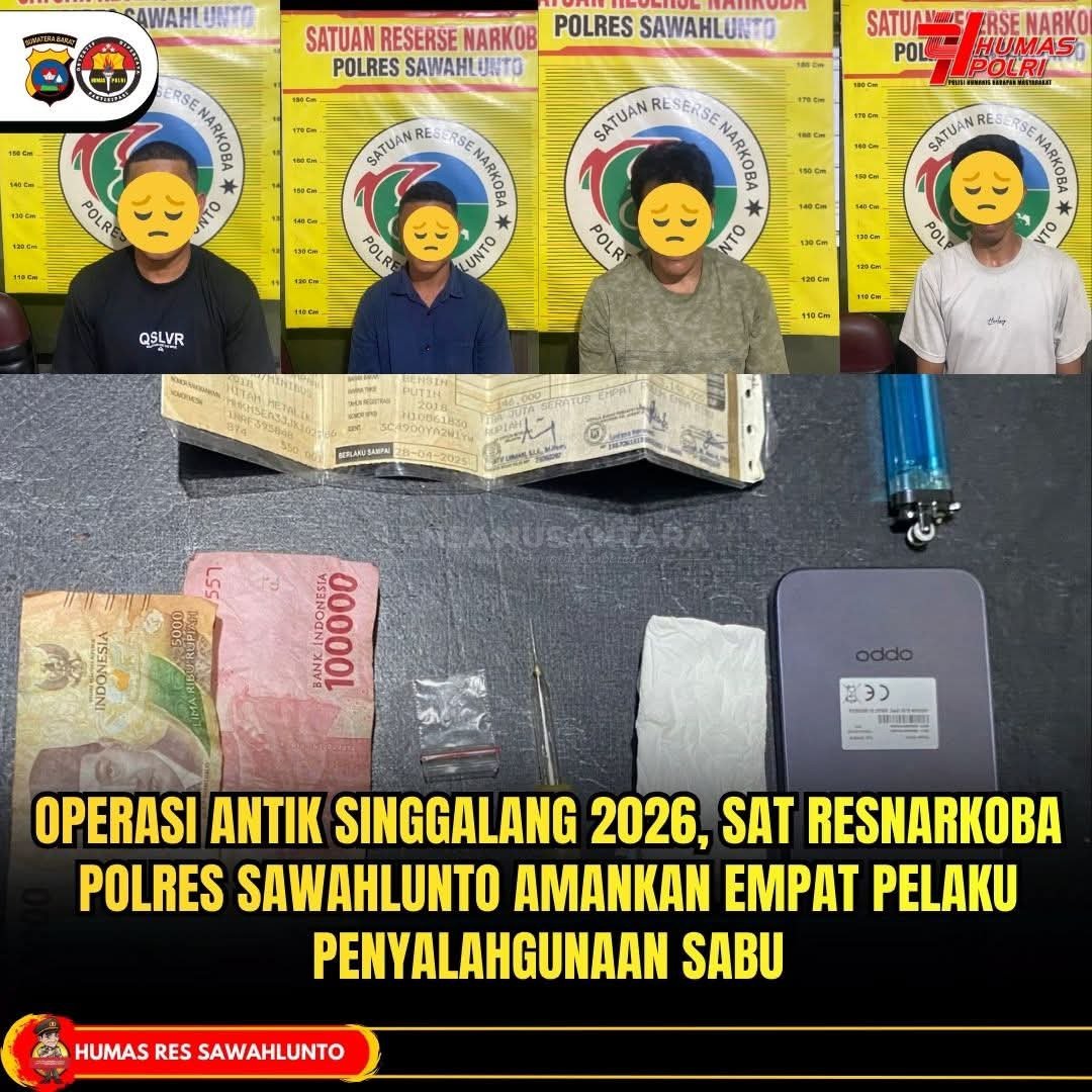 Sawahlunto, LENSANUSANTARA.CO.ID – Dalam rangka pelaksanaan Operasi Antik Singgalang 2026, Satuan Reserse Narkoba (Satresnarkoba) Polres Sawahlunto berhasil mengungkap kasus penyalahgunaan narkotika golongan I jenis sabu dan mengamankan empat orang terduga pelaku, Minggu (1/2/2026) sekitar pukul 16.00 WIB.