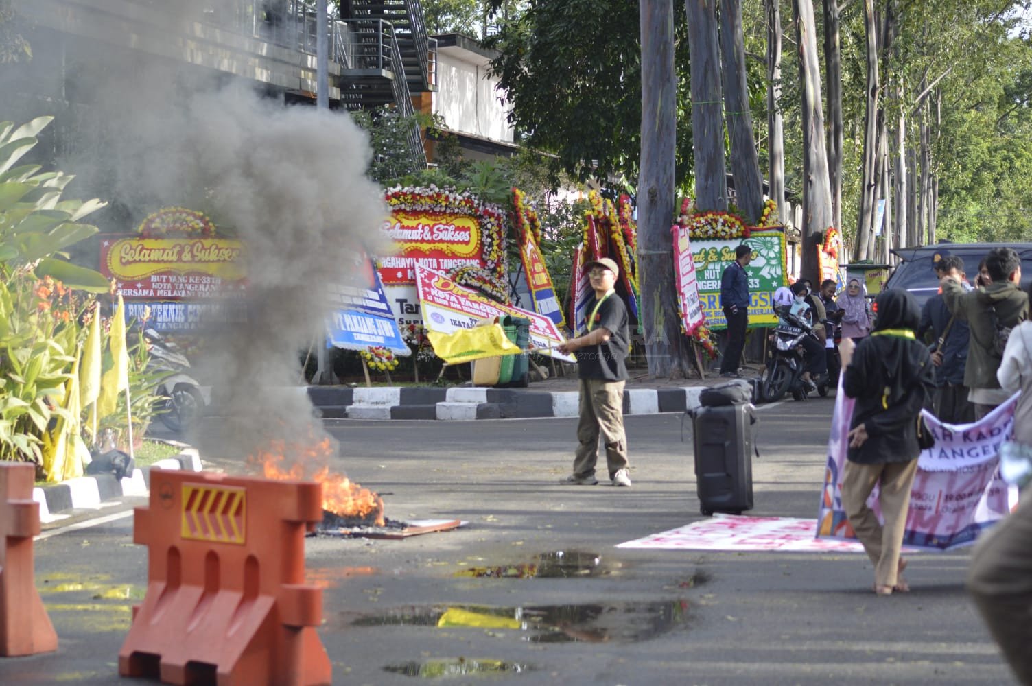 Dua organisasi mahasiswa, yakni Serikat Mahasiswa Muslimin Indonesia (SEMMI) Cabang Tangerang dan Sentral Mahasiswa Tangerang (SEMATA), menggelar aksi di depan Gedung Pusat Pemerintahan Kota Tangerang secara bergelombang sejak pukul 15.00 WIB.