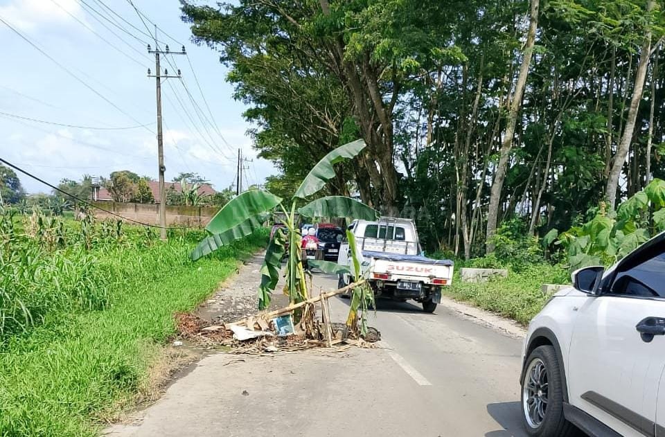 Menurut warga, penanaman pohon pisang di tengah jalan bukan semata-mata untuk menghalangi kendaraan, melainkan sebagai penanda agar pengendara mengetahui adanya lubang besar yang berpotensi menyebabkan kecelakaan.