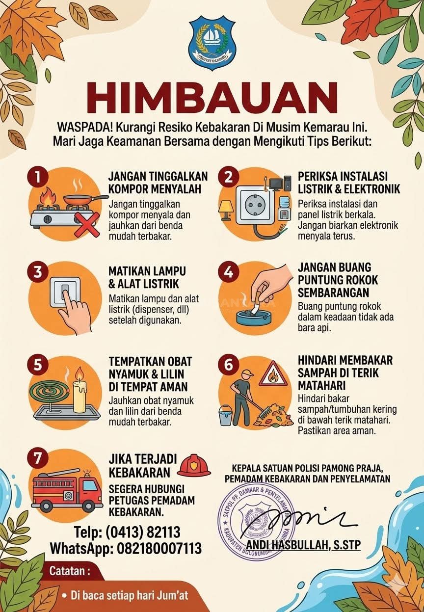 Bulukumba, LENSANUSANTARA.CO.ID – Satuan Polisi Pamong Praja, Pemadam Kebakaran dan Penyelamatan Kabupaten Bulukumba mengeluarkan peringatan resmi bagi seluruh masyarakat agar meningkatkan kewaspadaan terhadap bahaya kebakaran. Imbauan ini menjadi sangat krusial mengingat adanya pertemuan dua momentum penting, yakni datangnya musim kemarau dan mudik libur panjang menjelang Idul Fitri 2026.